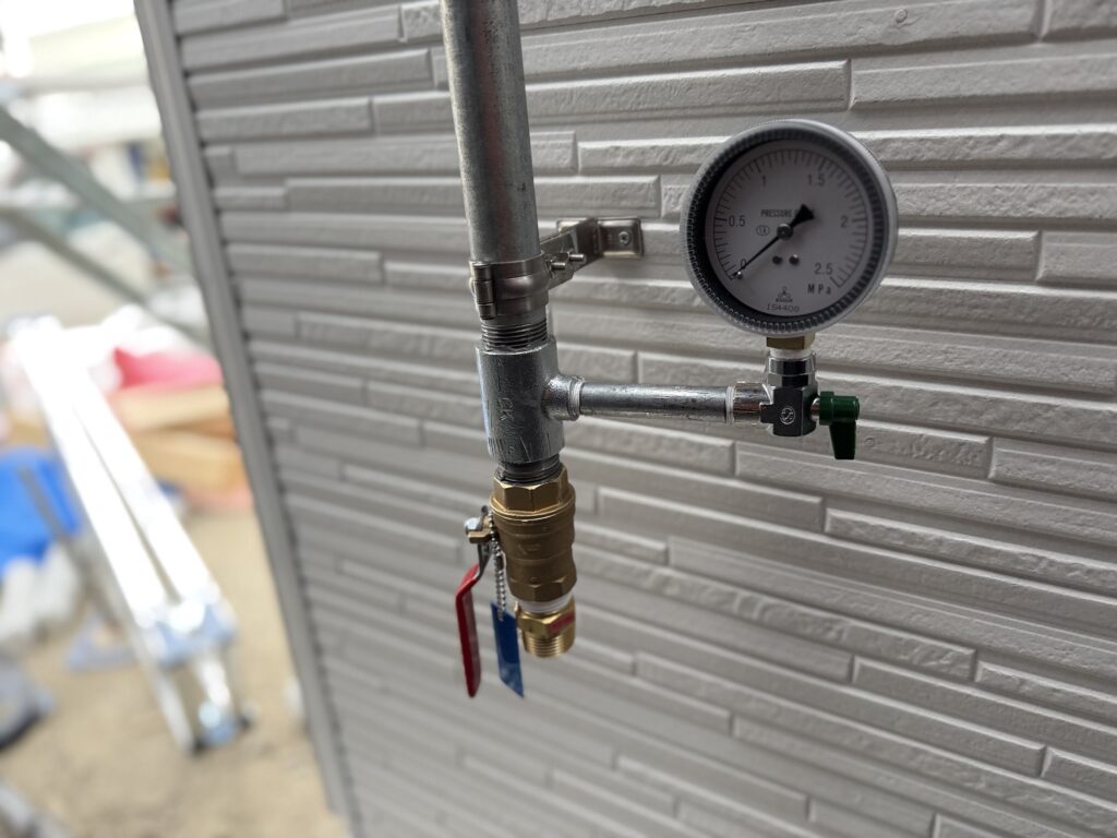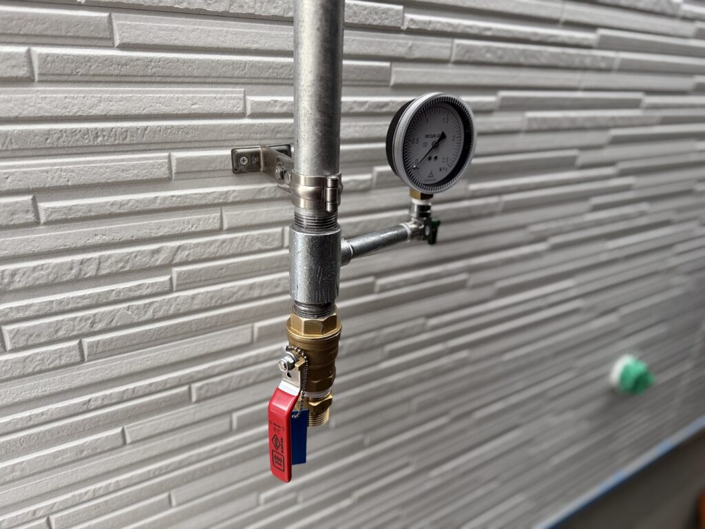 圧力計は、試験時に数値が確認しやすい位置に設置し、バルブ操作もスムーズに行えるようレイアウトを調整しました。また、配管は壁面にしっかり固定し、見た目の収まりだけでなく、長期使用でも緩みや負荷がかかりにくいよう配慮しています。
